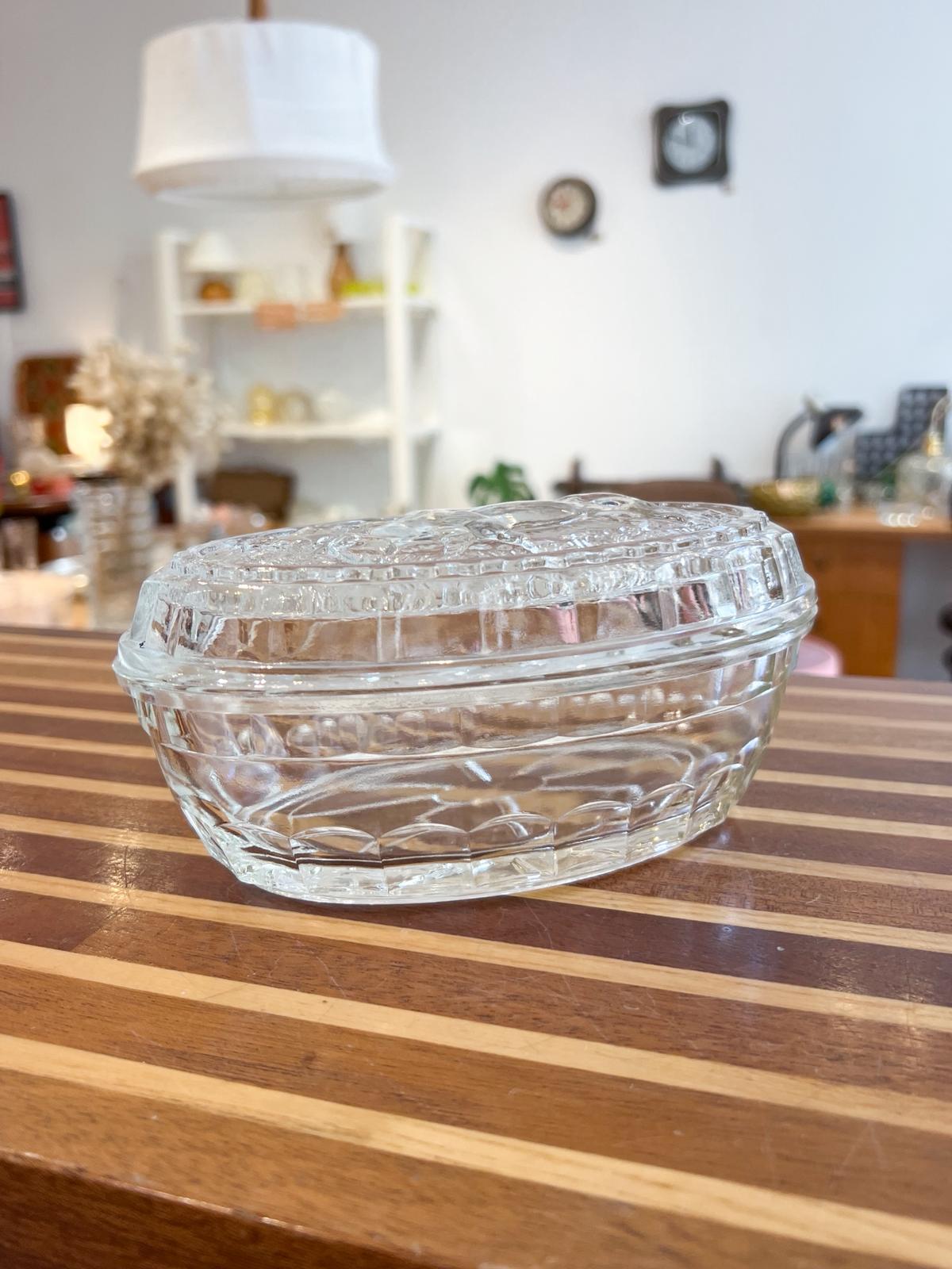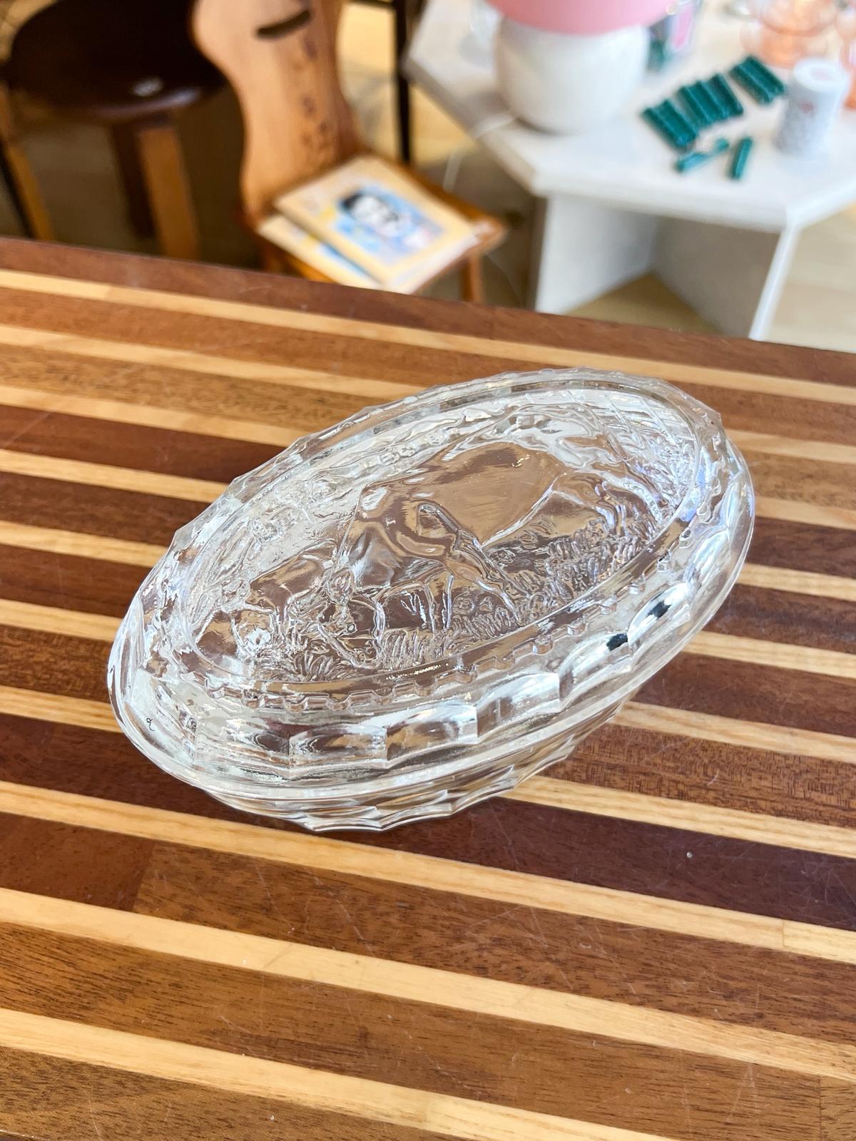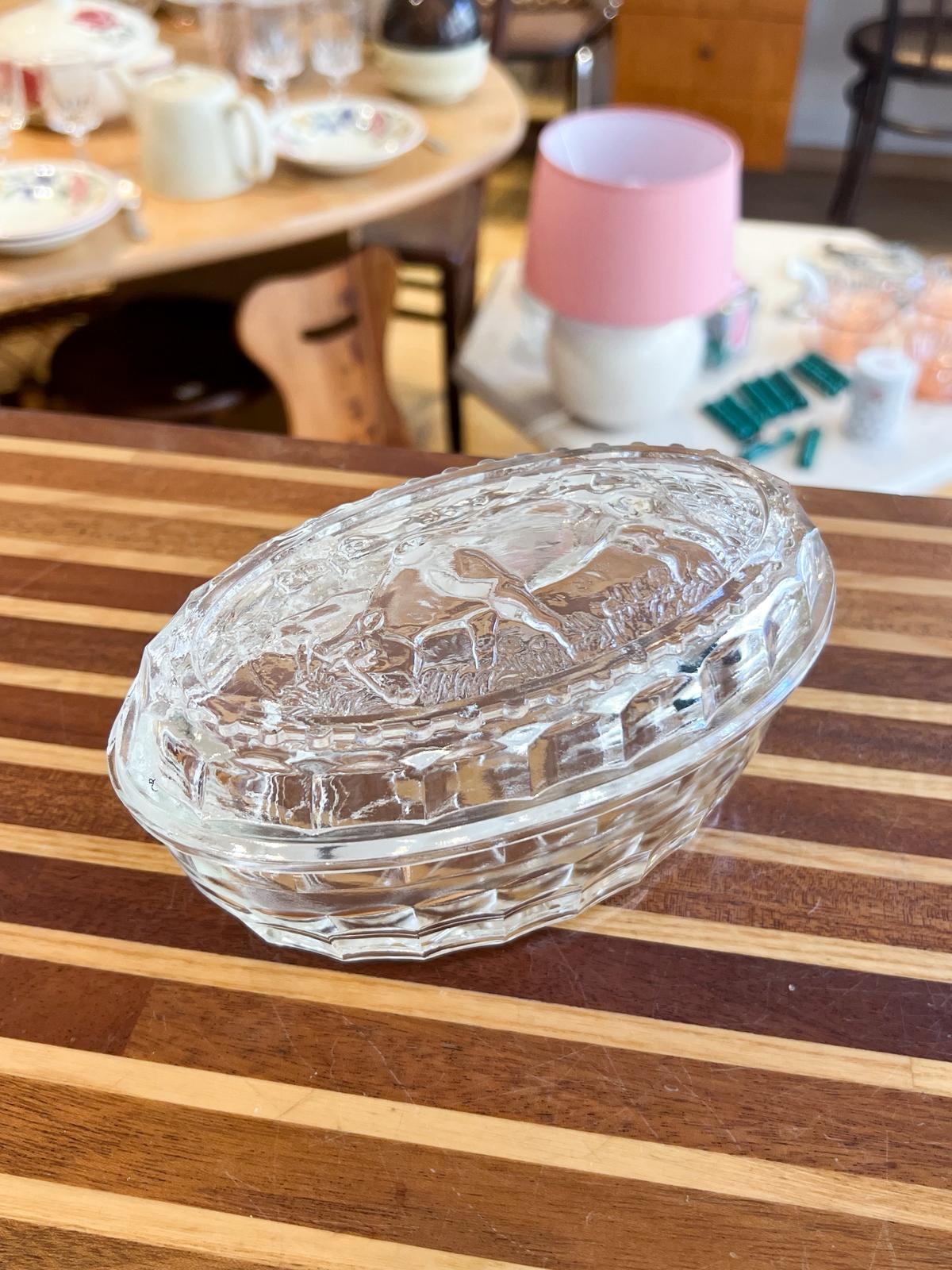 Superbe beurrier vintage en verre très épais. Décor « vache » – années 70. Très bon état.