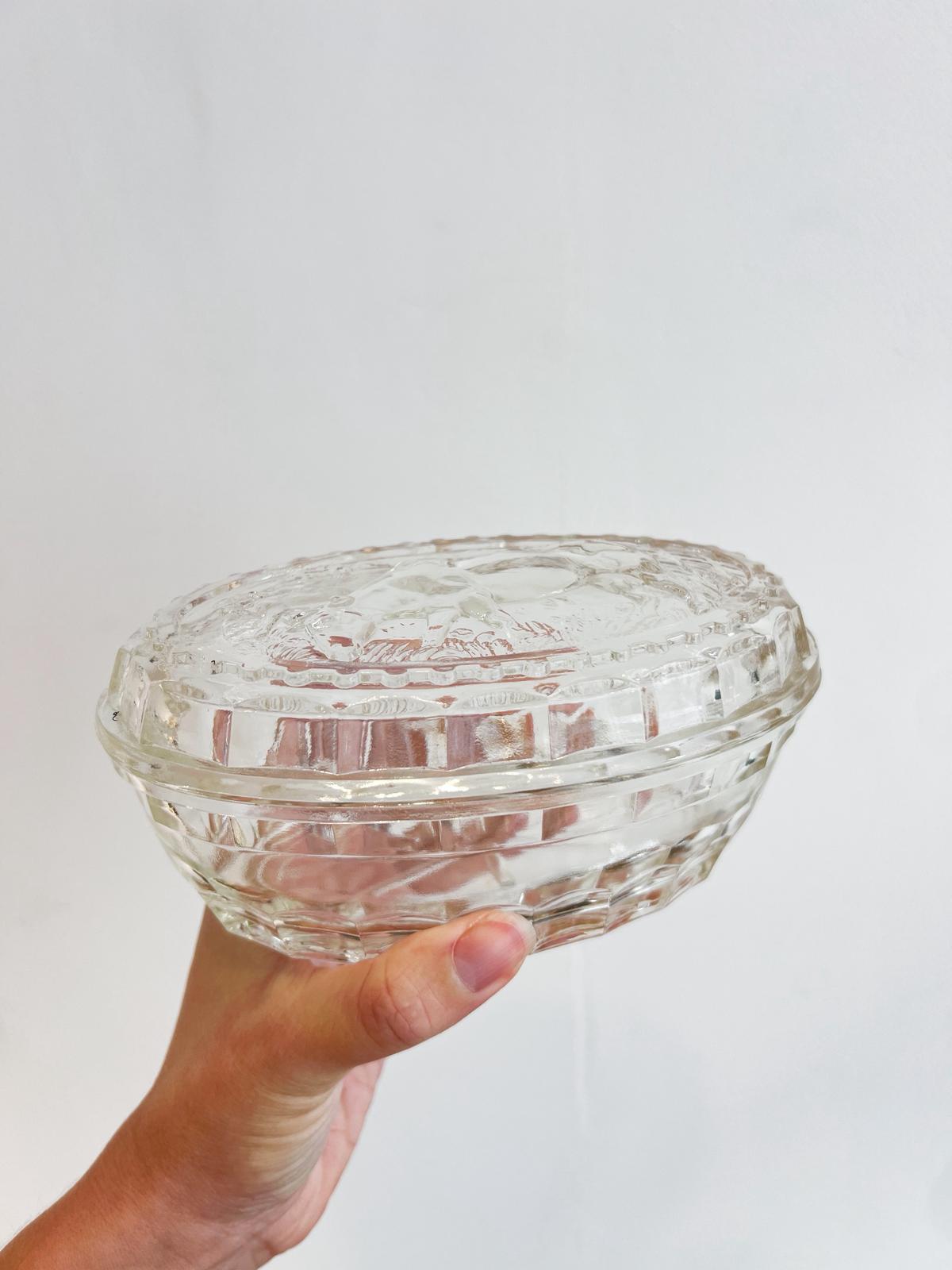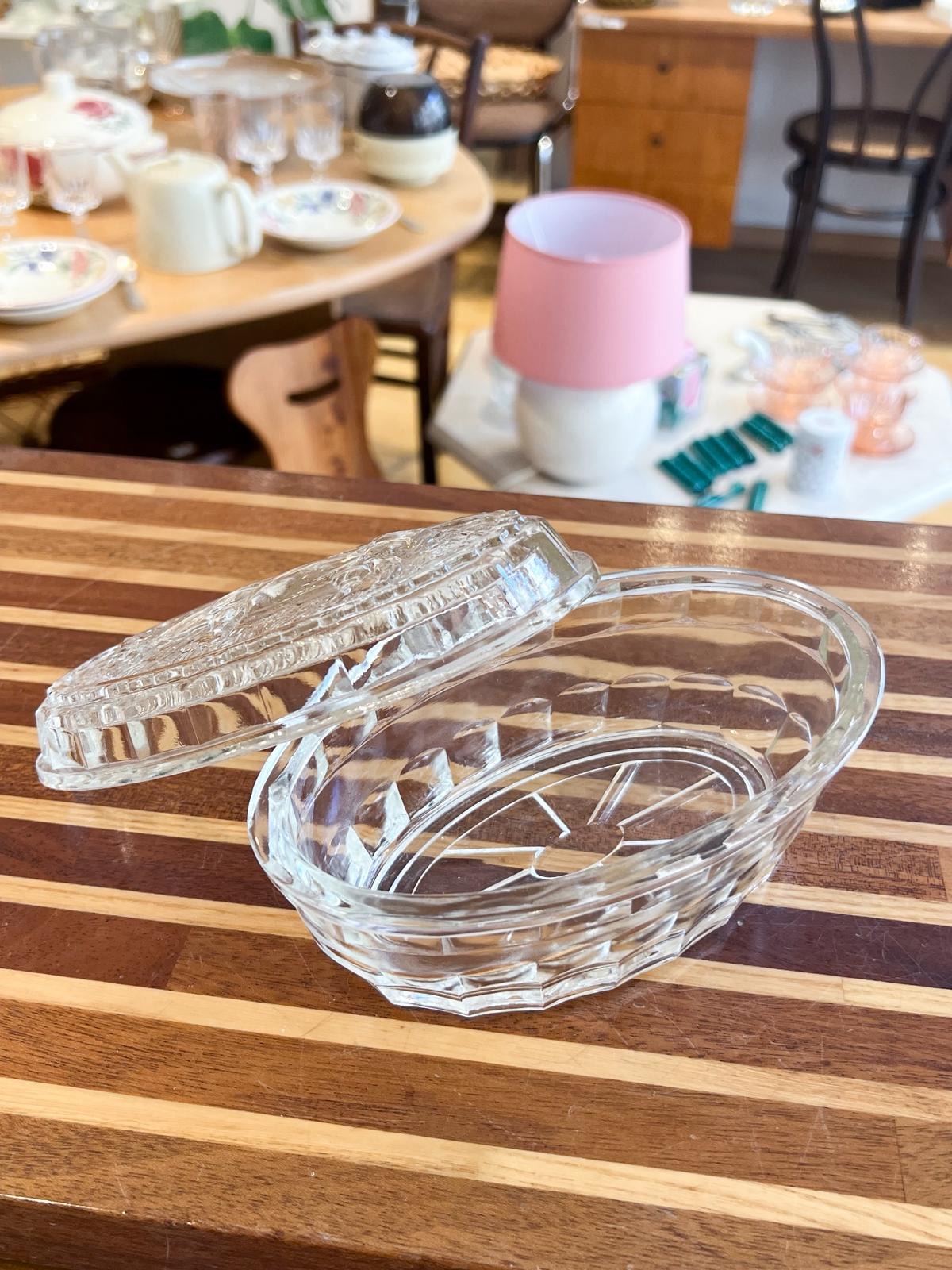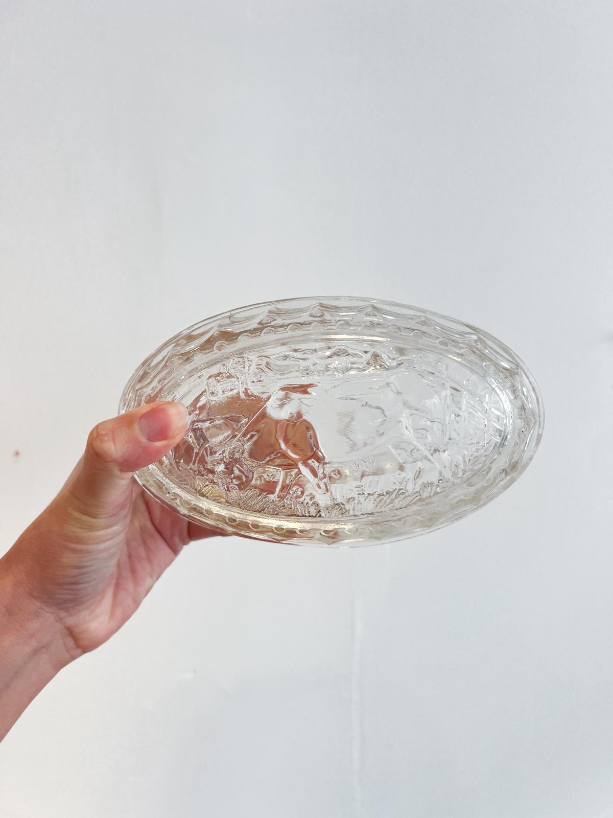 Superbe beurrier vintage en verre très épais. Décor « vache » – années 70. Très bon état.