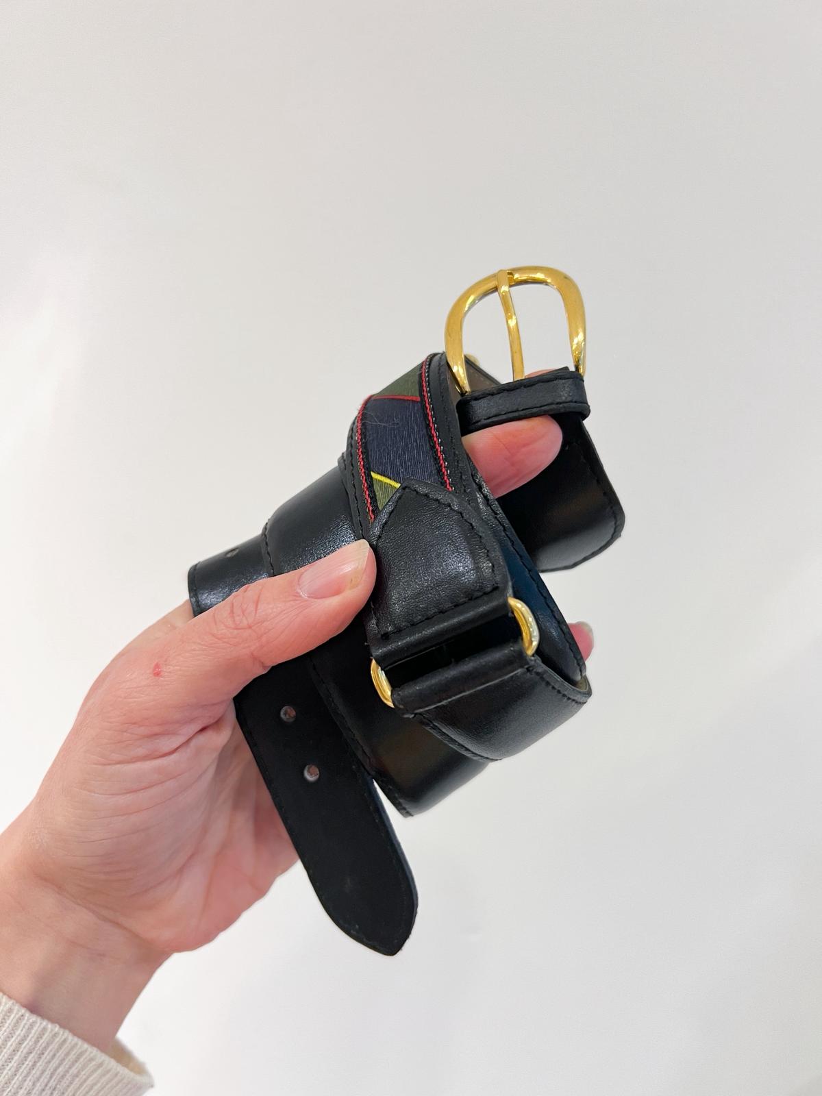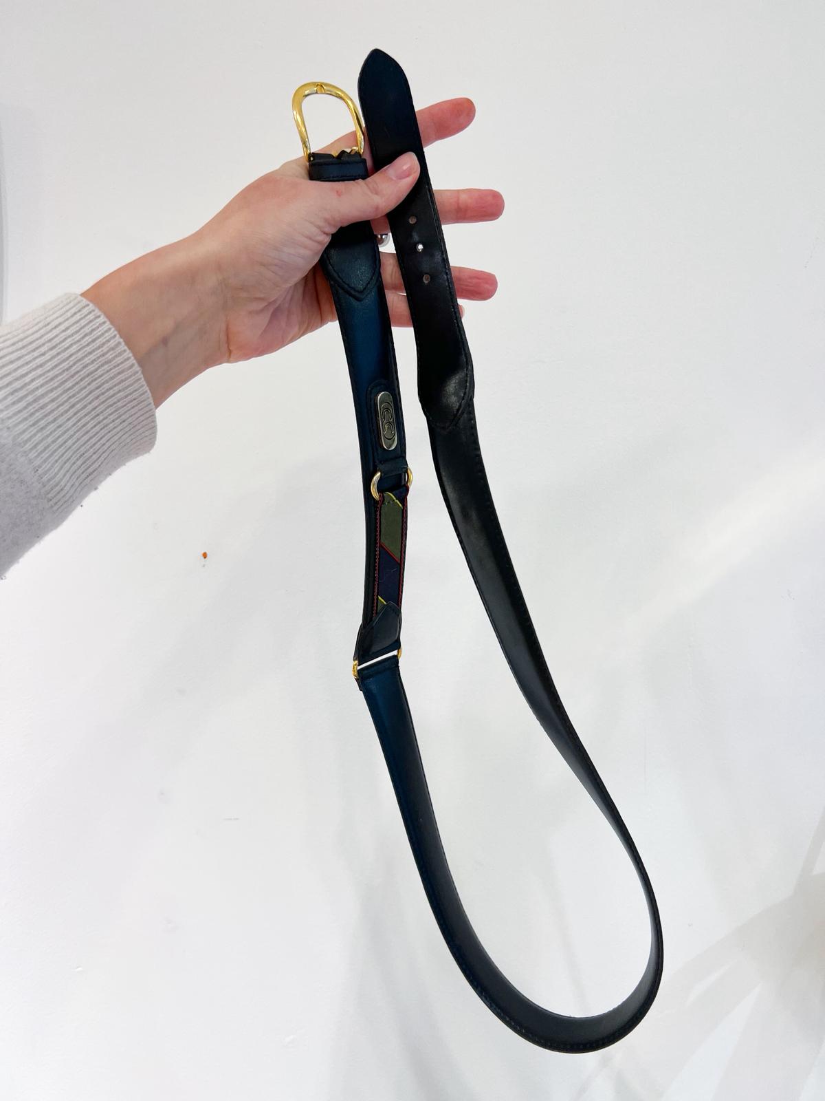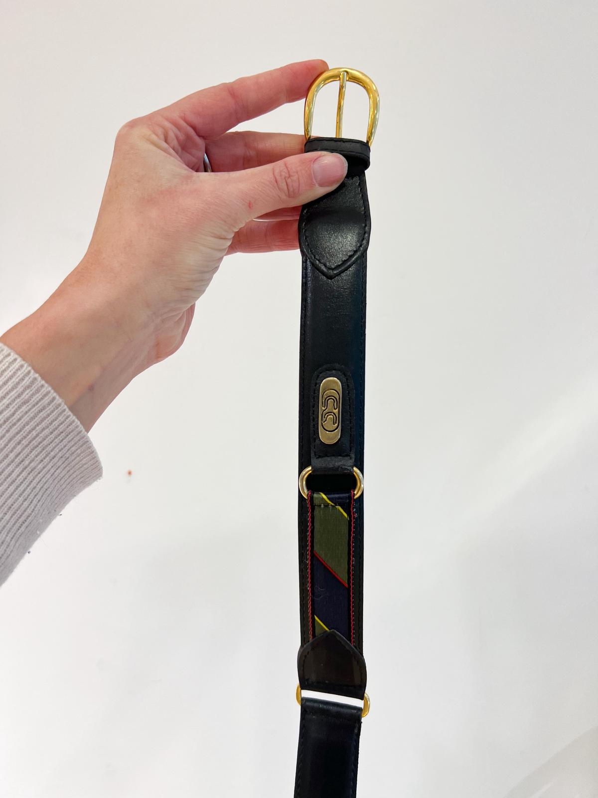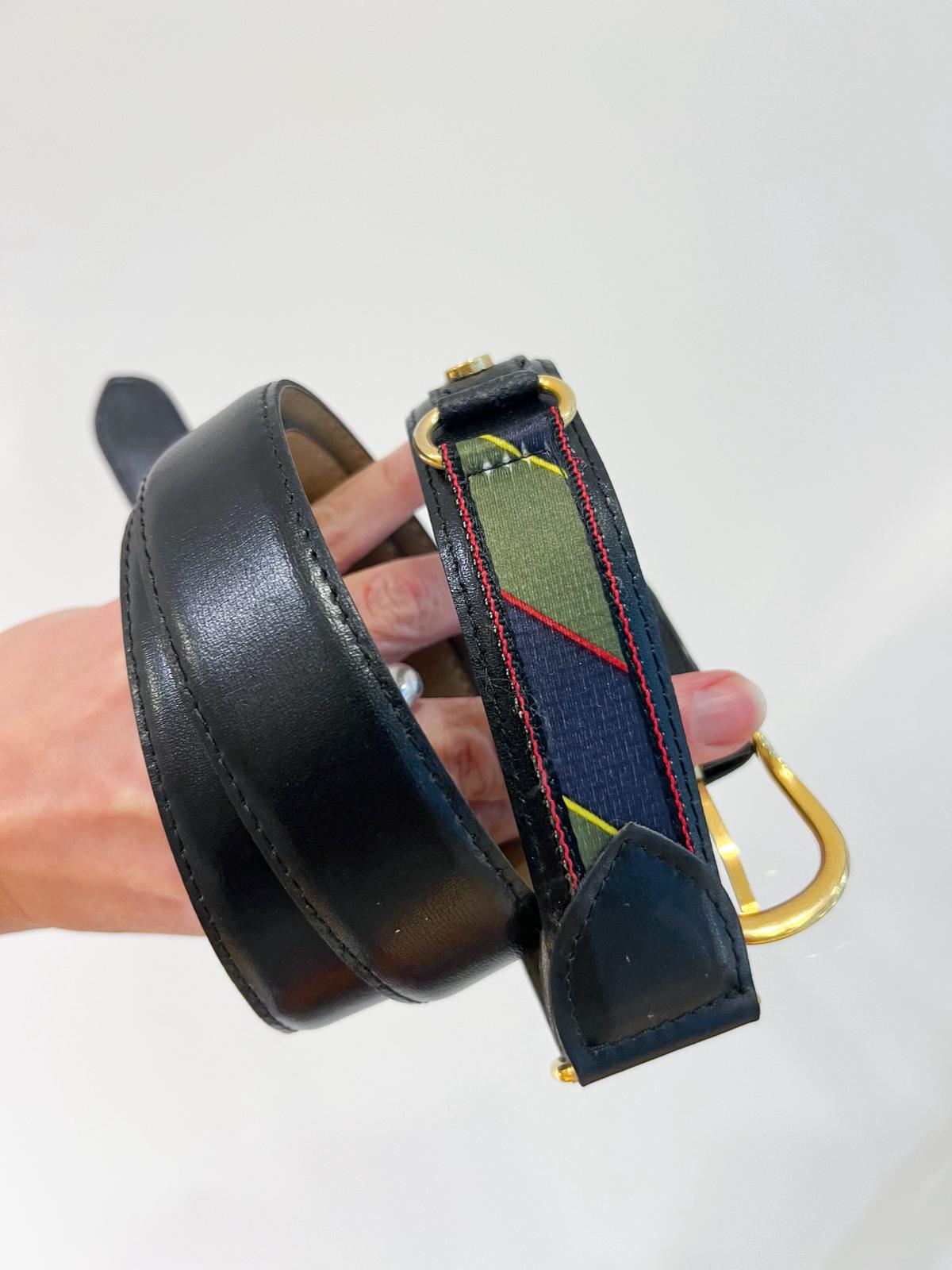 Jolie ceinture vintage en cuir noir avec bande de tissu kaki et bleu marine. Boucle dorée. 100cm. État proche du neuf. Longueur totale : 110 cm Largeur : 2,9 cm