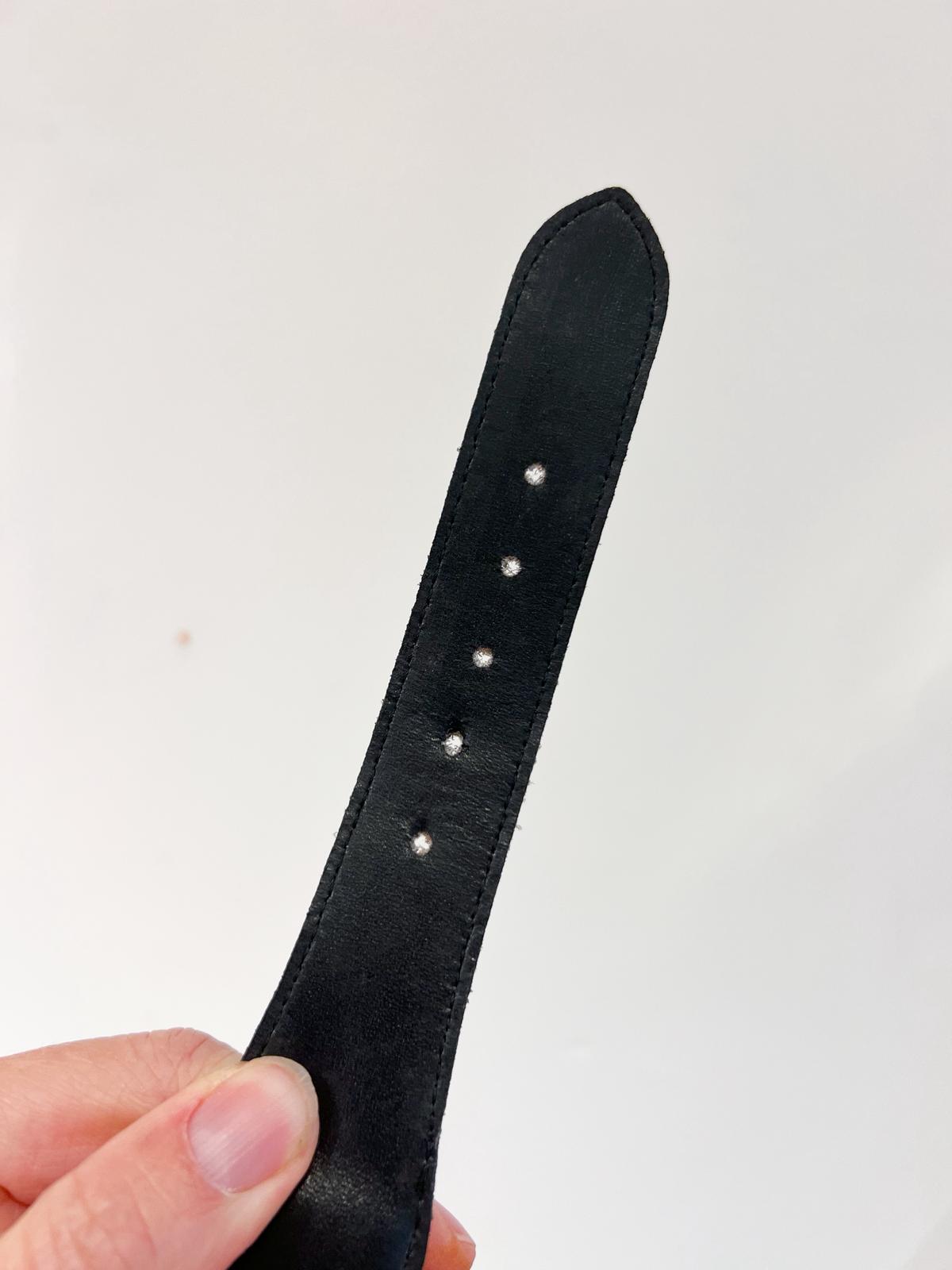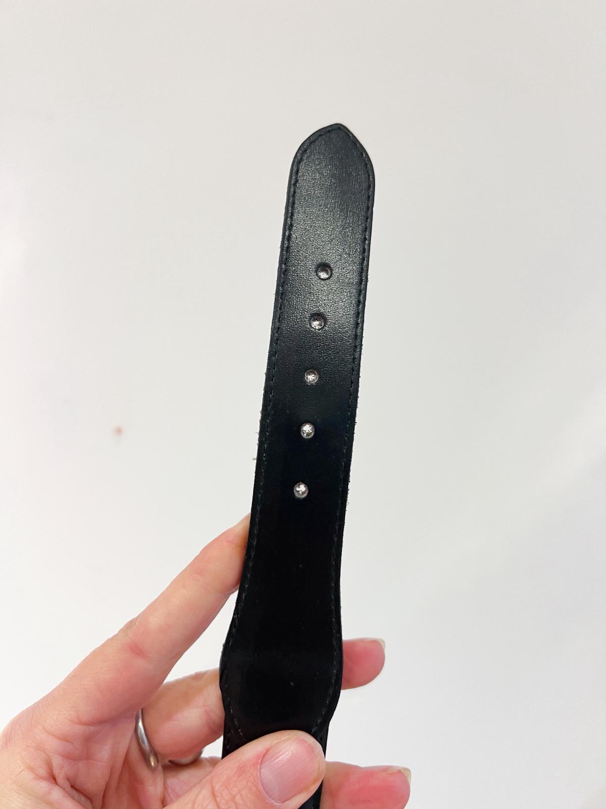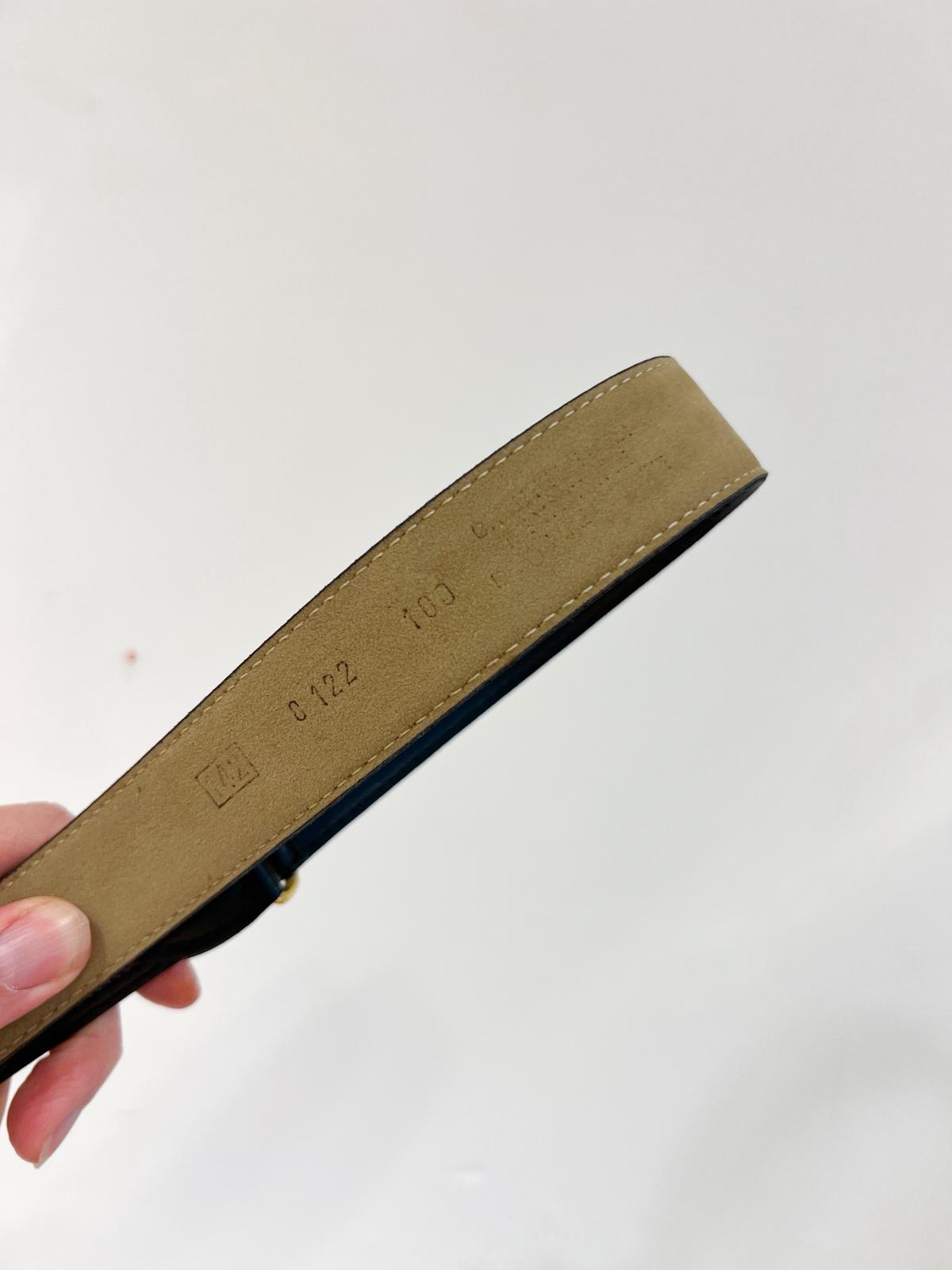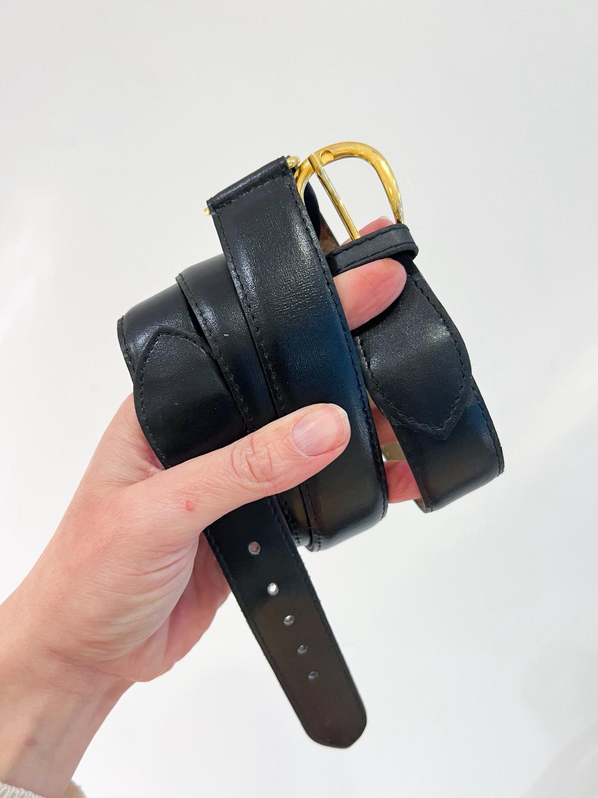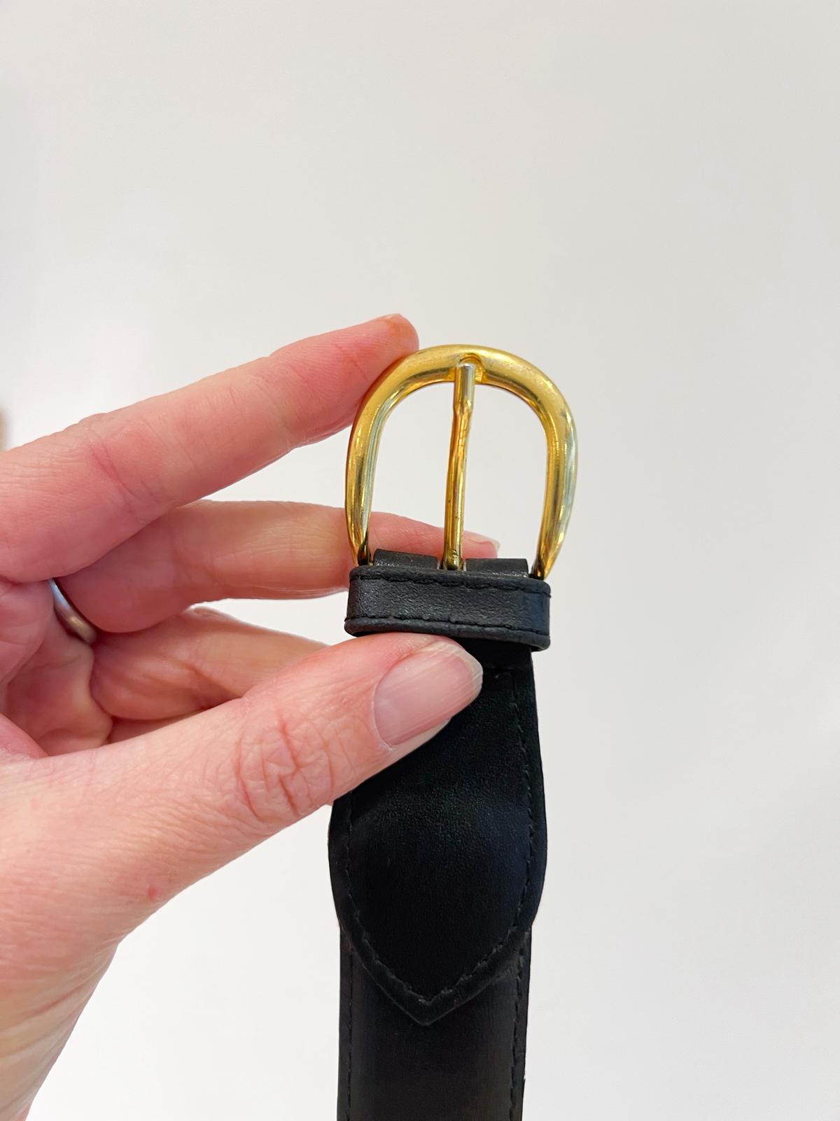 Jolie ceinture vintage en cuir noir avec bande de tissu kaki et bleu marine. Boucle dorée. 100cm. État proche du neuf. Longueur totale : 110 cm Largeur : 2,9 cm