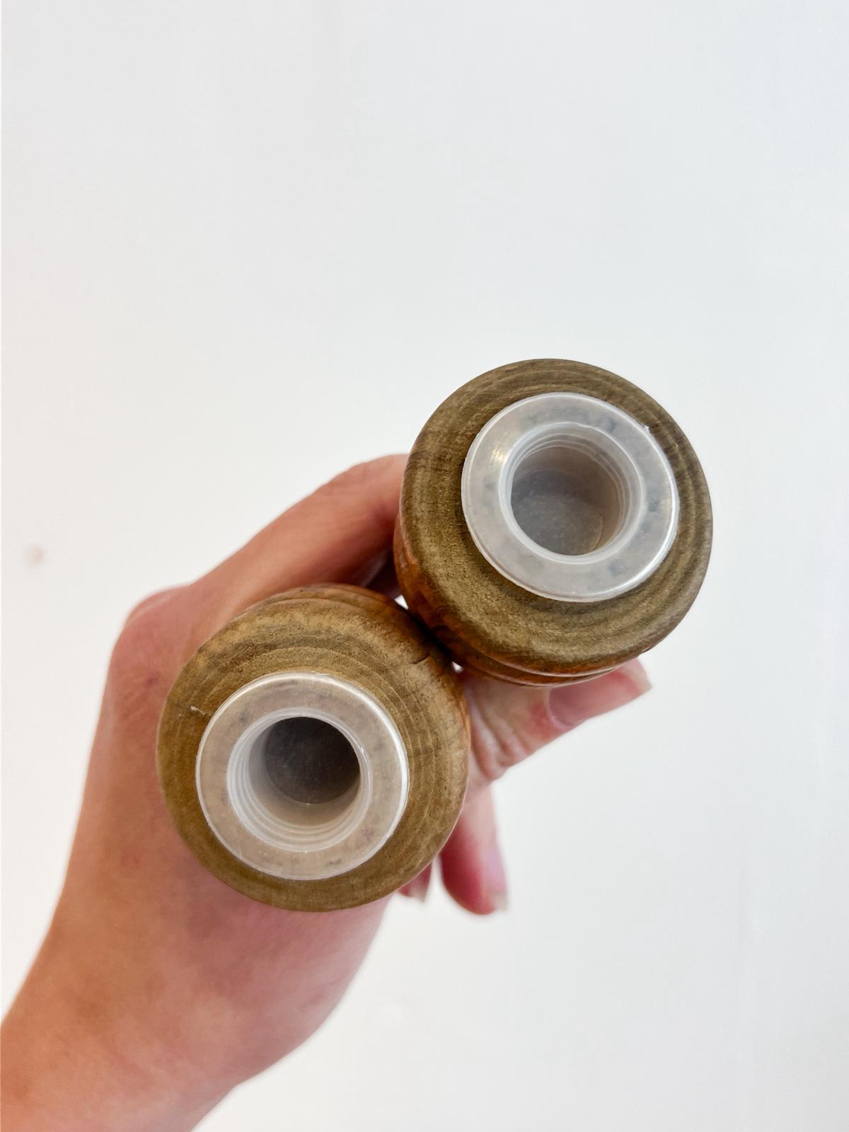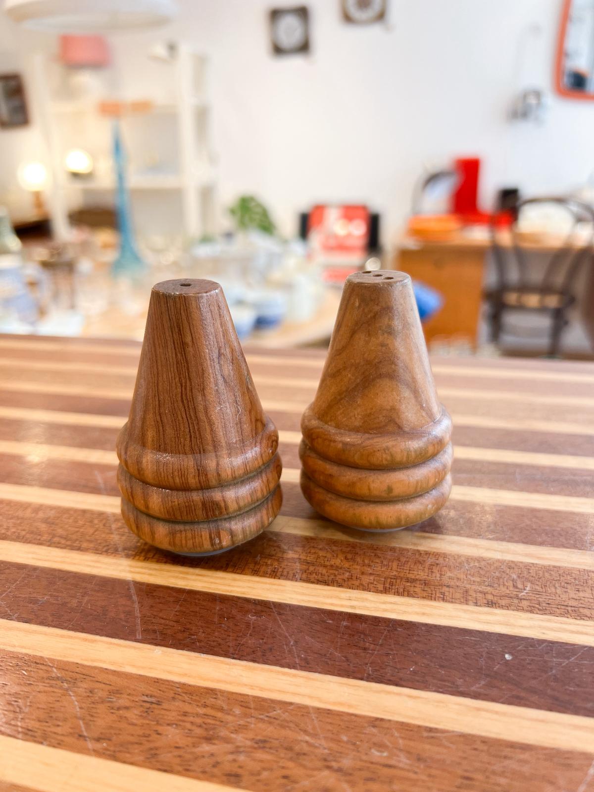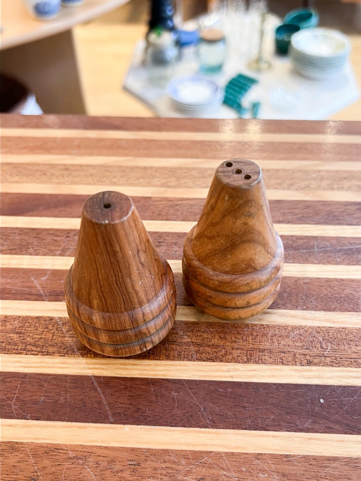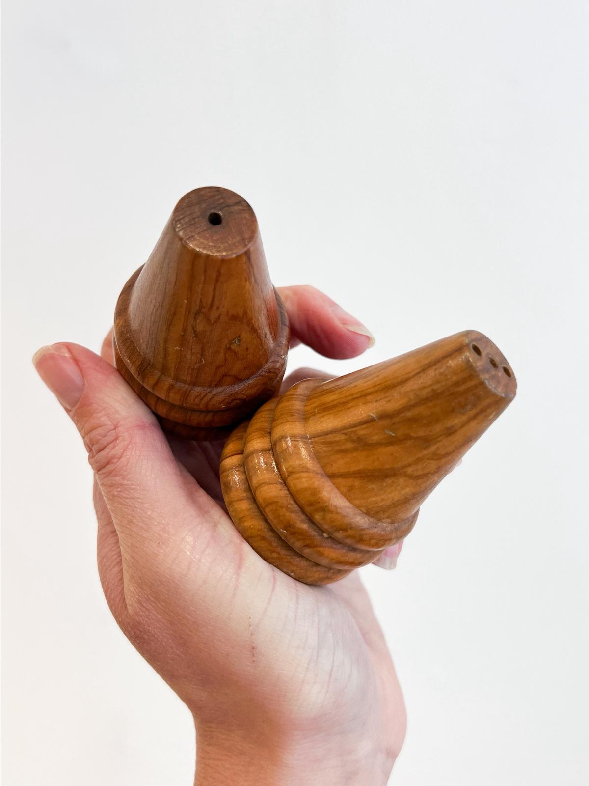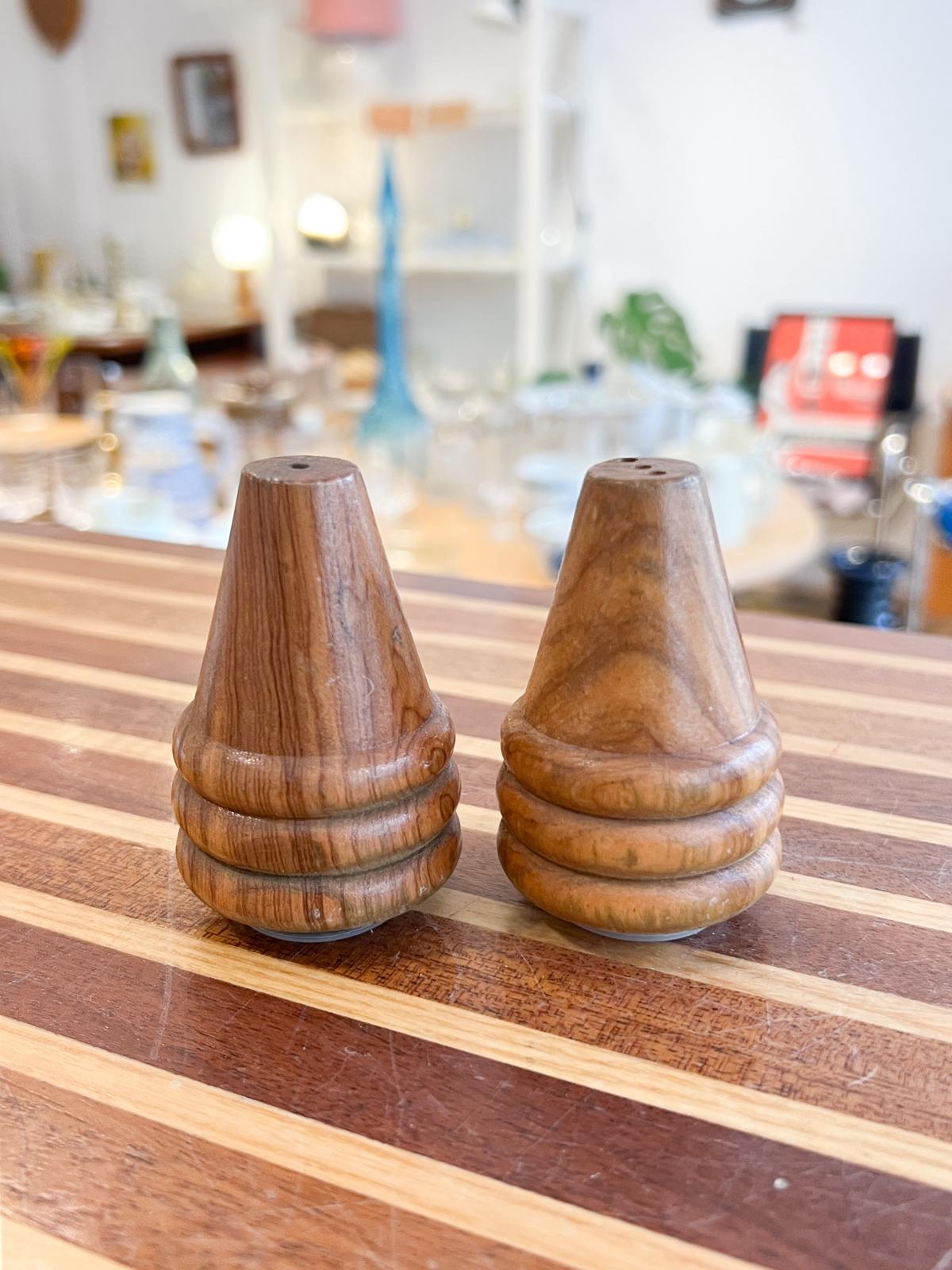 Jolies poivrière et salière vintage en bois d’olivier. Très bon état. Bouchons hermétiques.
