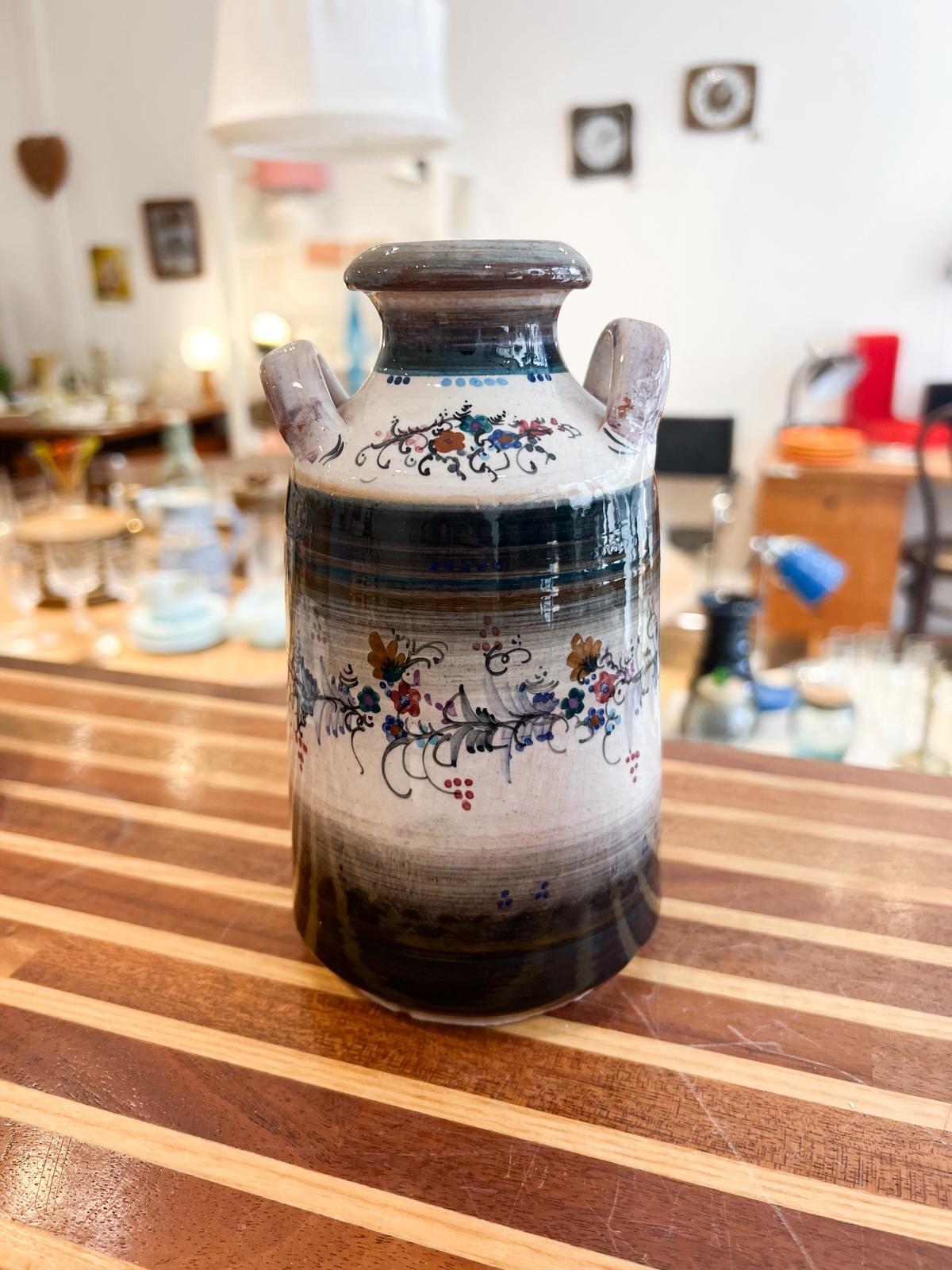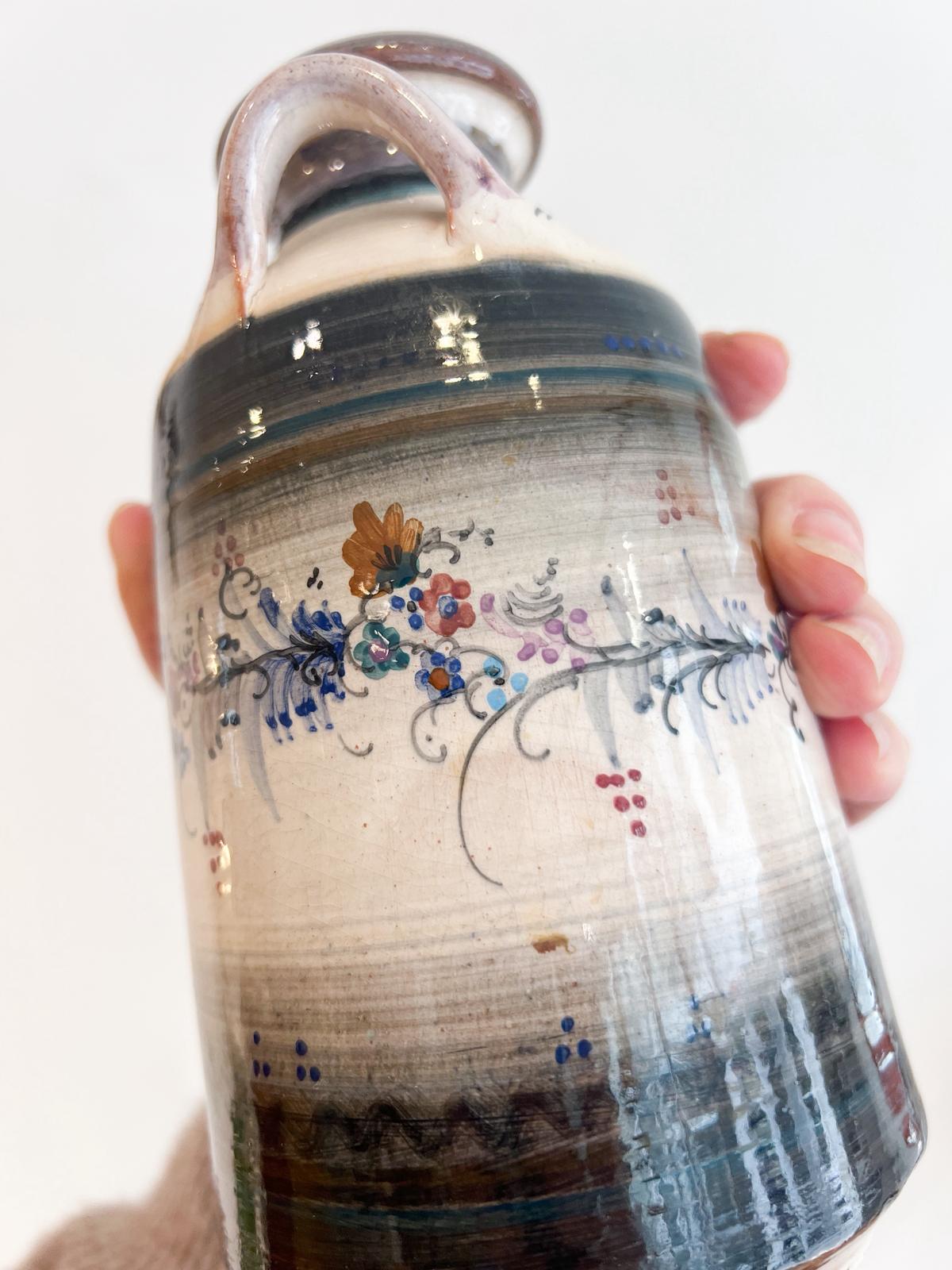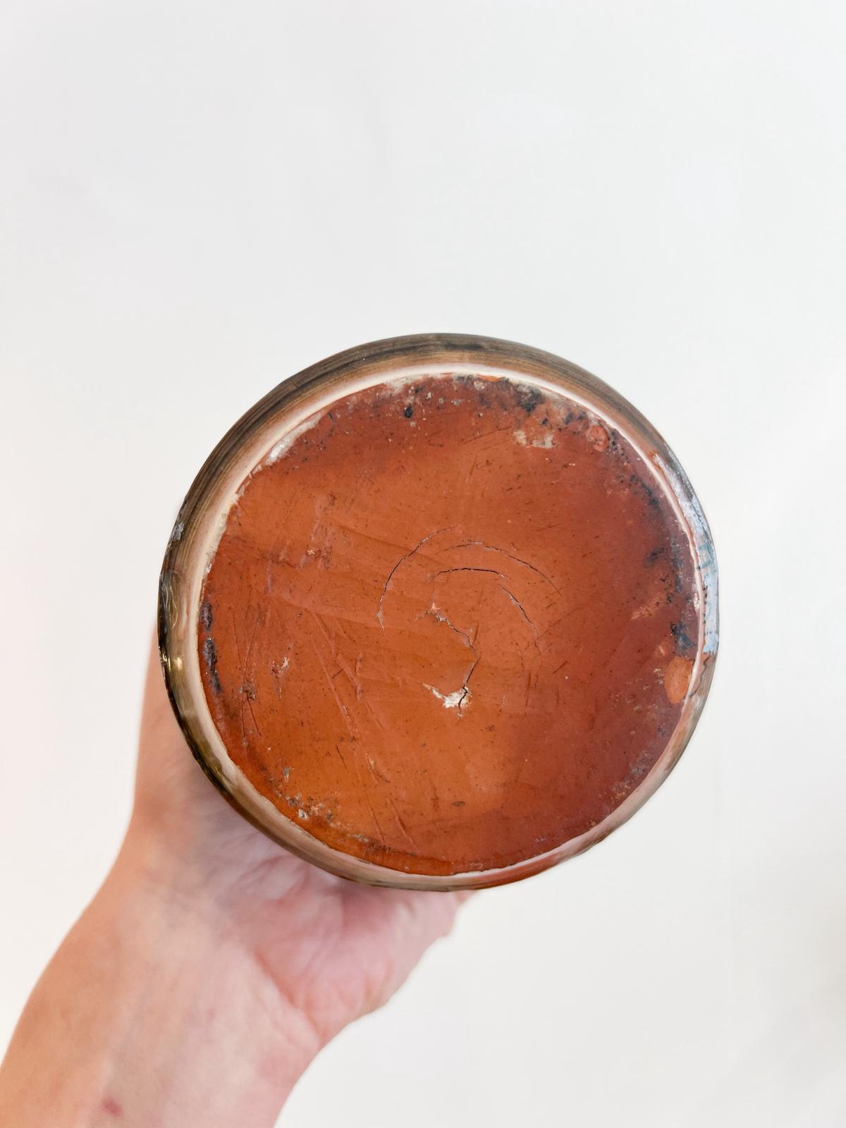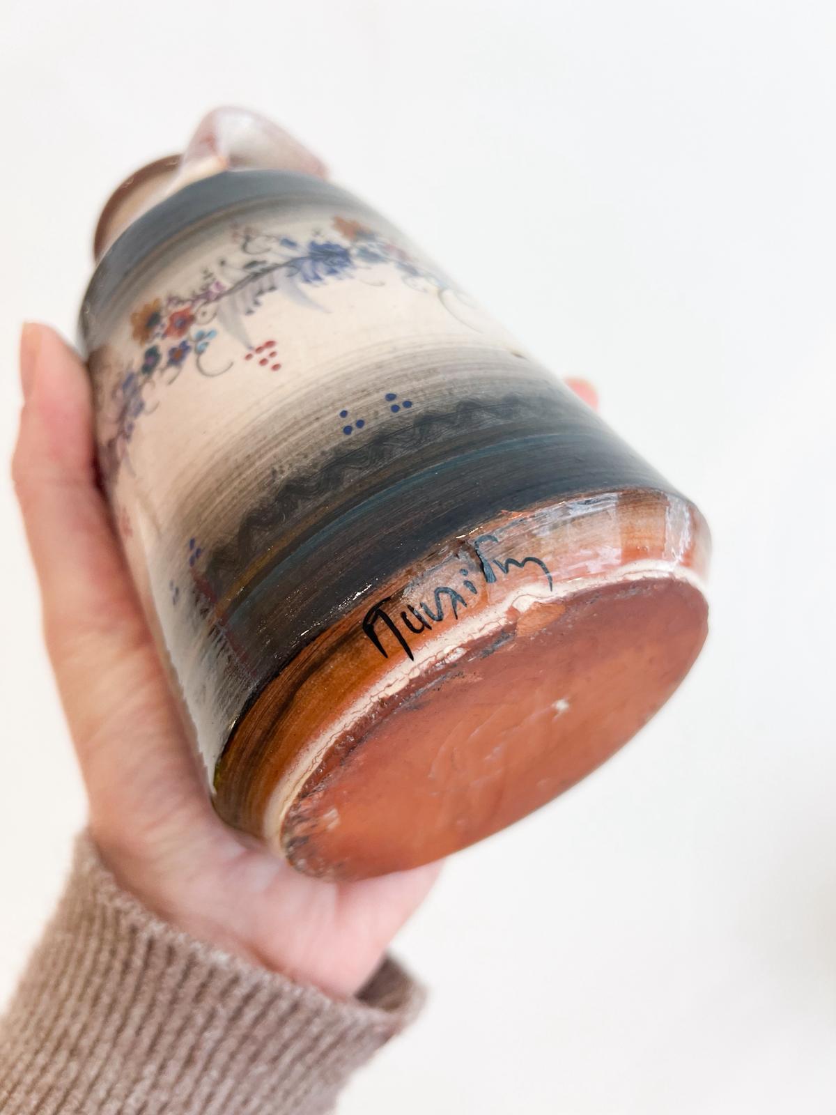 Très jolie poterie en terre cuite émaillée et décorée à la main. Signée. Très bon état.