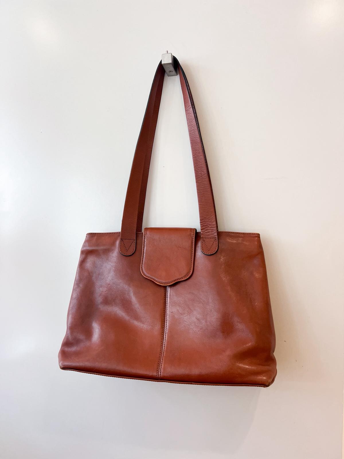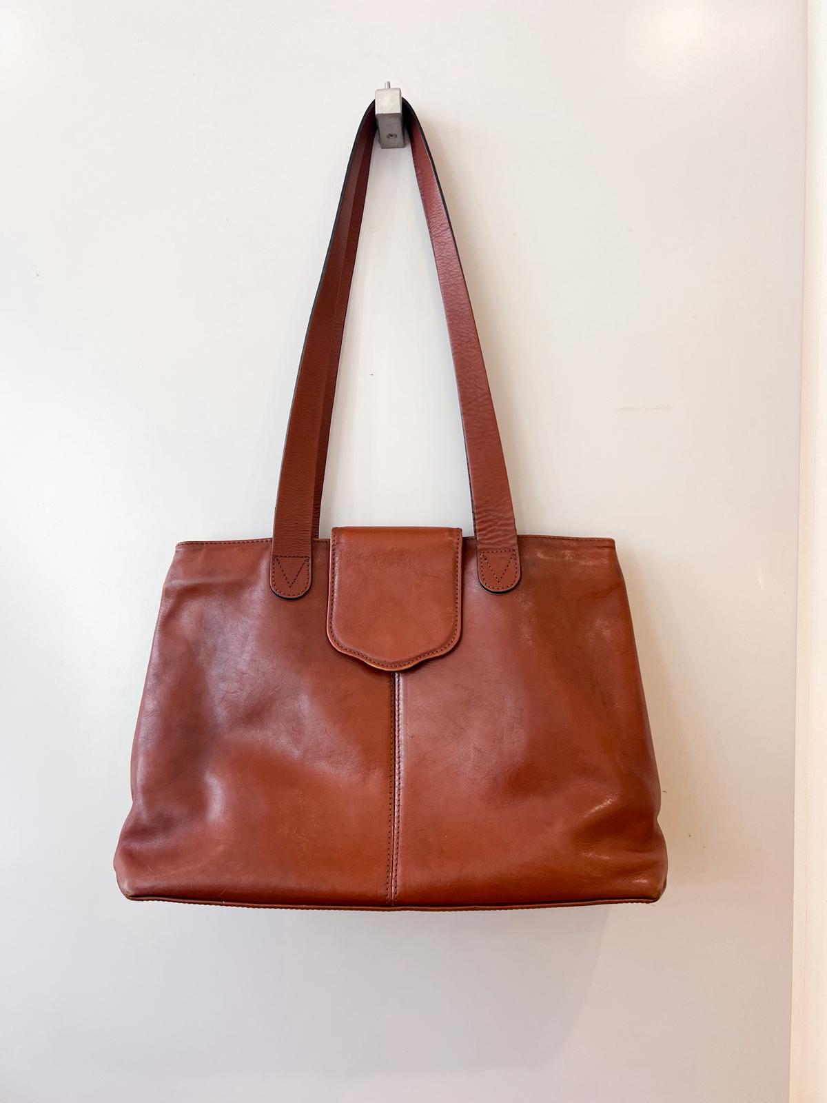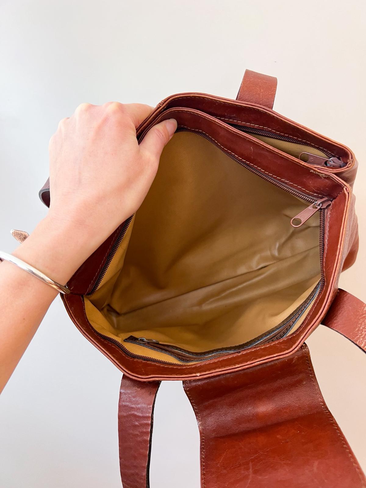 Très beau sac à main porté épaule en cuir marron. Le cuir est très joliment patiné. Légères marques d’usure à noter aux coins externes. L’intérieur est en très bon état, composé de deux compartiments principaux zippés + 1 petite poche interne zippée. Également une poche externe zippée. Les fermetures éclair coulissent bien. Très bon état général.