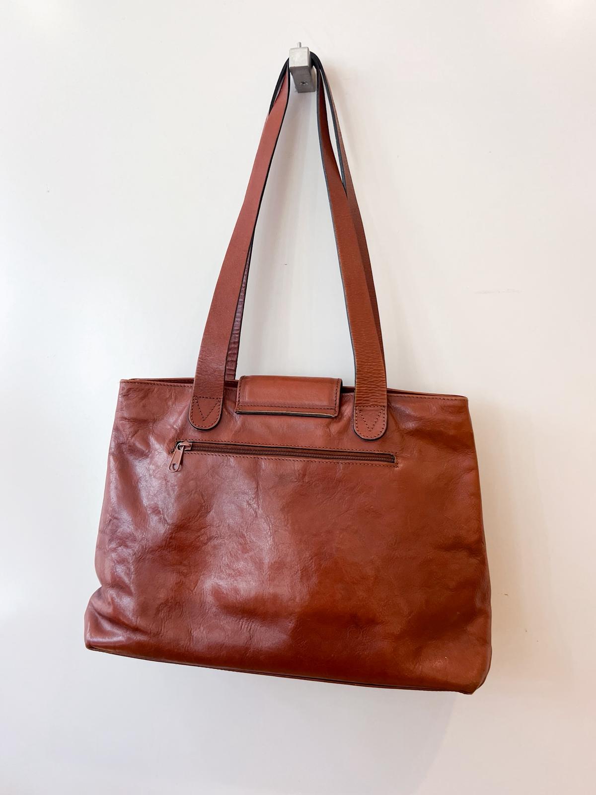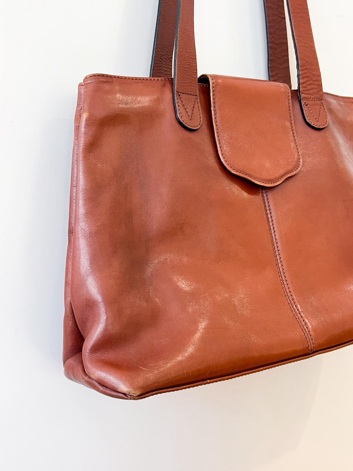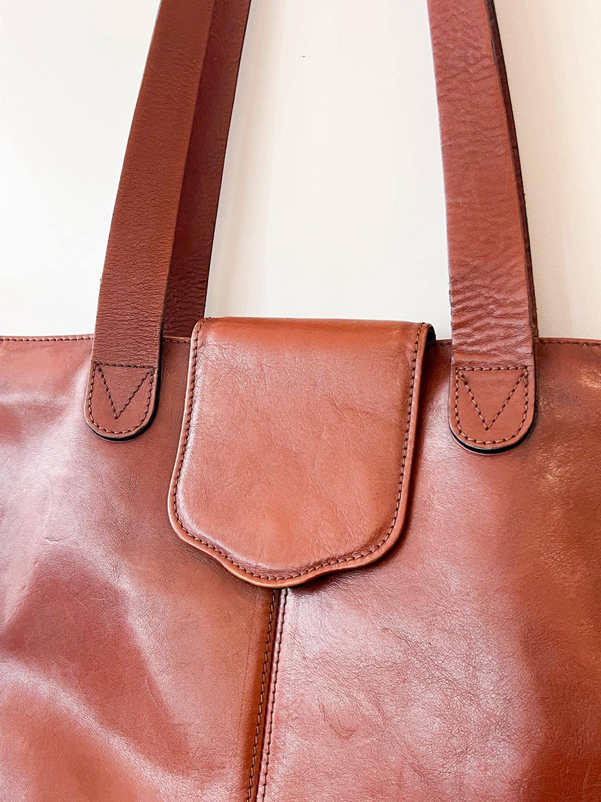 Très beau sac à main porté épaule en cuir marron. Le cuir est très joliment patiné. Légères marques d’usure à noter aux coins externes. L’intérieur est en très bon état, composé de deux compartiments principaux zippés + 1 petite poche interne zippée. Également une poche externe zippée. Les fermetures éclair coulissent bien. Très bon état général.