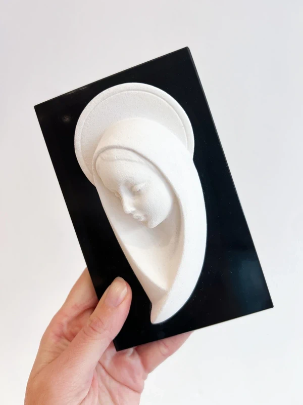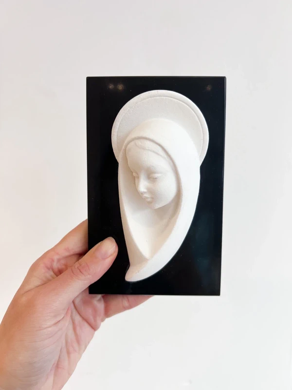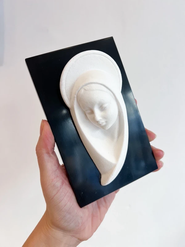 Belle statuette murale de la vierge Marie. Pierre Blanche sur un socle en marbre véritable. Made in France. Très bon état.
